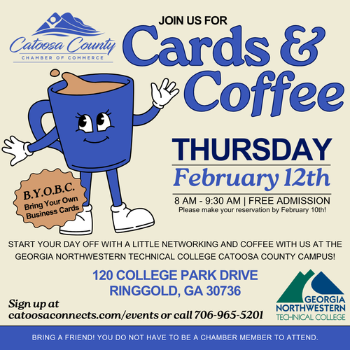 Join us for Cards & Coffee on February 12th from 8am - 9:30am at the GNTC Catoosa County Campus. Drop in, get a coffee, and network!