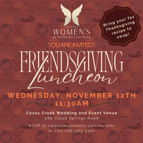 Take the time to join us for a great lunch while visiting with friends and NEW connections at our quarterly Catoosa Women's Networking Luncheon.